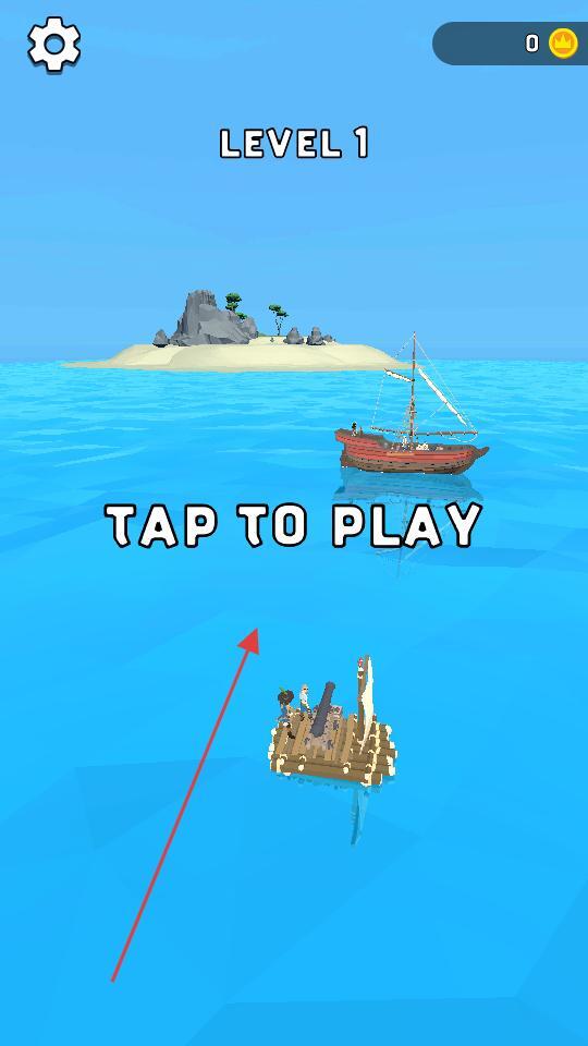1、启动海盗袭击游戏,进入关卡选择页面,点击“TAPTOPLAY”按钮,操控木筏上的角色,准备开启海上射击挑战。