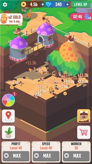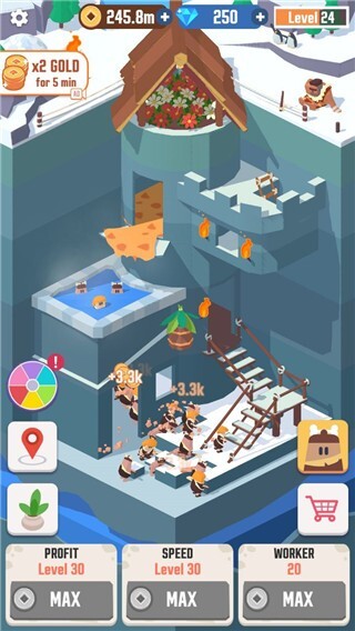 打造地下世界,点击建设功能,持续积累金币与收入,购置建筑原材料来搭建房屋和楼宇,建造上百种建筑物获取收益,成为原始人地下世界里的百万富翁。
