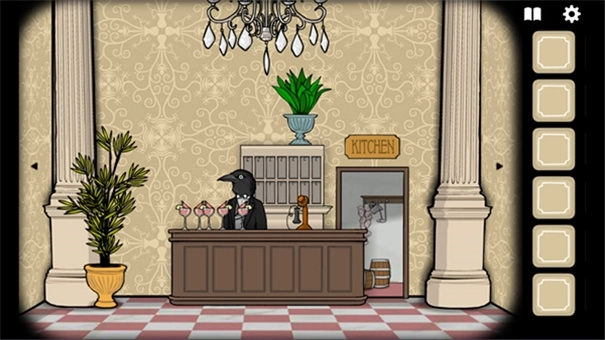 3、首先前往前台区域,旁边的门是通往厨房的通道。前台放置的五杯“鲜虾鸡尾酒”需要取走(这口味真是让人难以形容……)。当乌鸦先生出现时,他会说:“欢迎各位客人光临,请务必周到体贴地为他们提供服务。”
