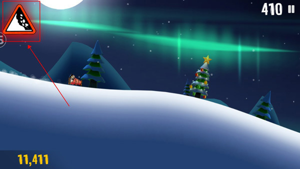 3、屏幕左侧上方的雪崩警示牌会在雪堆即将靠近时持续闪烁发出警告,即便你已经能在视野里看到身后汹涌而来的大雪,要是这时起身继续滑行,想摆脱这近在眼前的雪堆也未必没有可能。