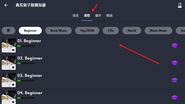 即使你从未接触过架子鼓,也能跟着游戏里的演奏教程逐步学会技巧,轻松上手体验;而熟练的玩家则可以自由发挥进行演奏,丰富的曲库任你选择演绎,还能通过录制功能保存下你的精彩瞬间!