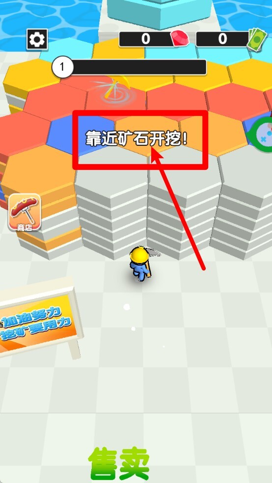 1.采矿操作提示:当靠近彩色砖块所在区域时,系统会自动弹出“靠近矿石开挖”的提示,此时便可开展挖掘与收集操作。