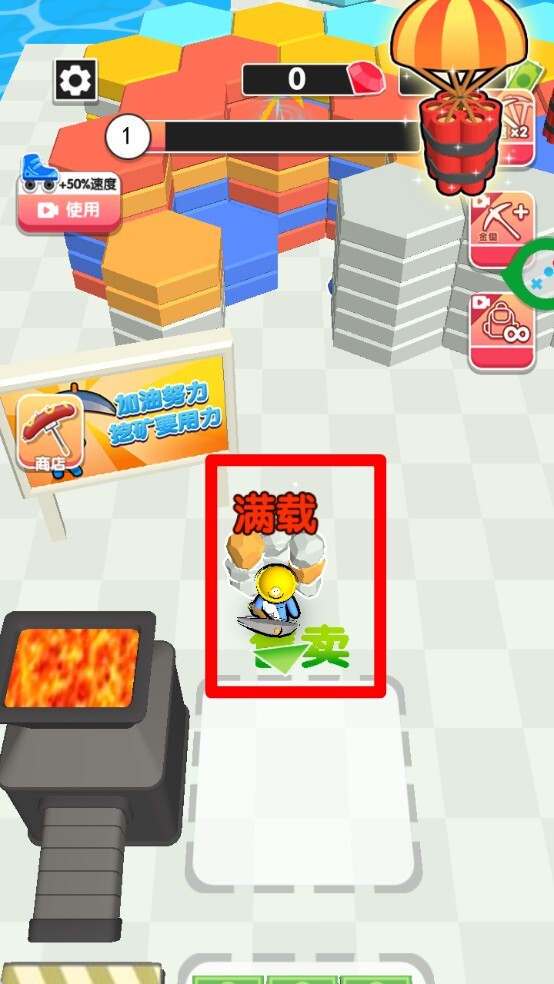 3.背包负重机制:当角色身上的矿石数量达到上限时会显示“满载”提示,这时需要把矿石运送回回收区域售卖以换取货币。