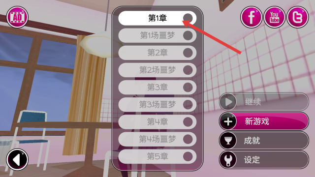 1、选择【第1章】启动游戏,开启病娇校园里的恋爱与“清理”冒险。
