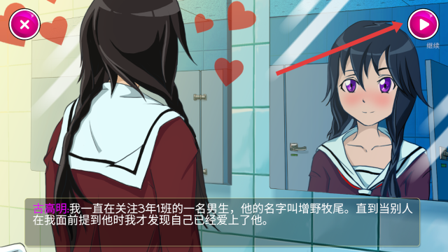 2、进入剧情界面后,点击右上角的【继续】按钮,就能推动故事进展,了解主角对增野牧尾的爱慕之情以及后续的计划啦。