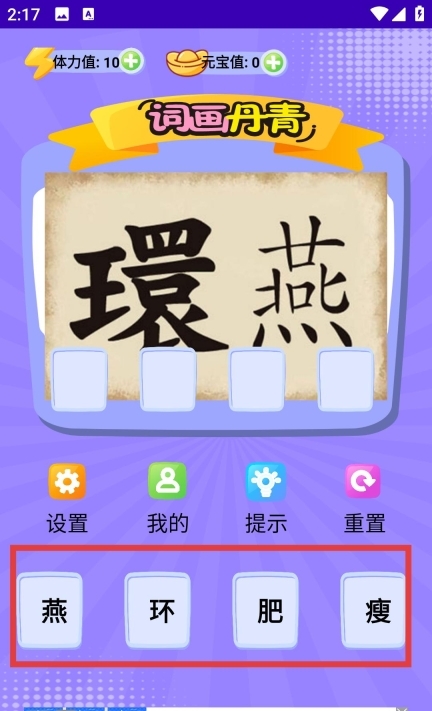 1、下载并安装“词画丹青”游戏,进入游戏界面后,仔细观察呈现的文字与选项,通过点击对应的字来组合成正确的词语,以此完成各关卡的挑战。