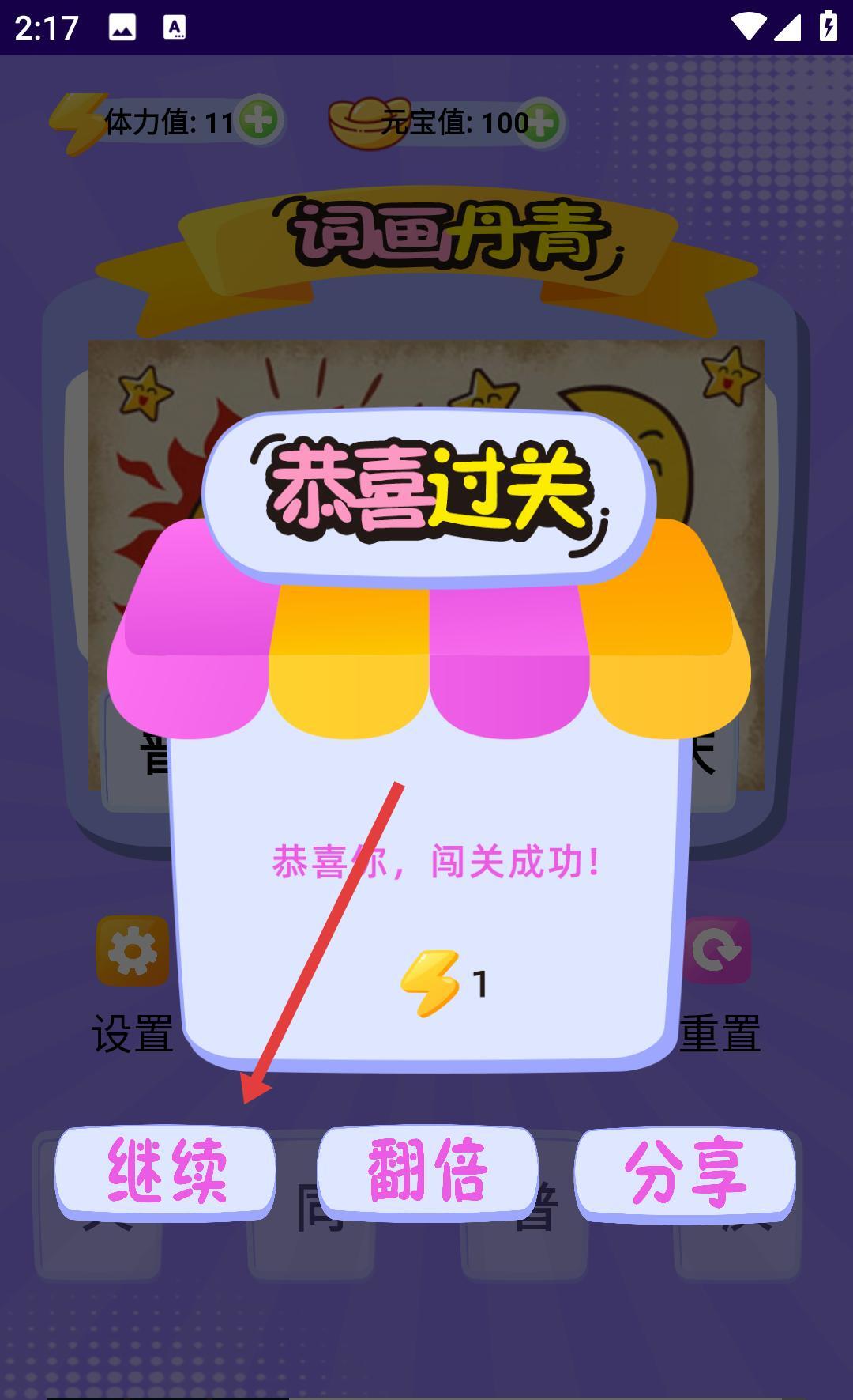 2、玩家闯关成功后,点击“继续”即可进入下一关,届时将面对新的文字题目,需要通过思考组词来完成答题。