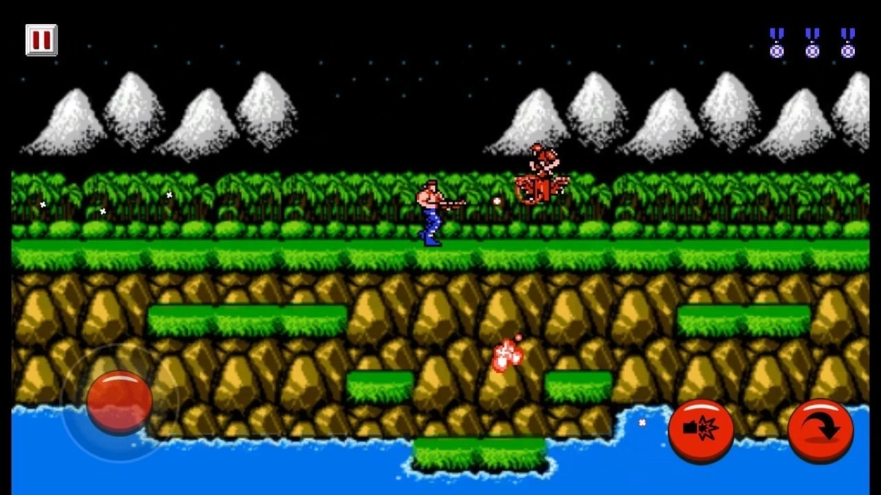 游戏开始时,玩家手中是一把普通冲锋枪,能够朝八个方向进行射击;不过在获取强化武器后,就会切换使用其他武器。玩家具备跳跃能力,跳跃过程中还能借助方向键来操控移动方向与开火方向,并且这种跳跃时的方向控制在游戏里起着相当关键的作用。一旦玩家直接接触到敌人或者敌人发射的子弹,就会导致死亡;但敌人及其子弹常常会布满整个屏幕,还会朝着各个方向移动,因此躲避它们需要一定的技巧。游戏里会时不时出现橄榄形的飞行物,将其击毁后会掉落强化武器;获得这些强化效果,能够提升武器的发射速度、伤害值以及发射角度,不过这些强化效果在玩家死亡后是无法保留的。