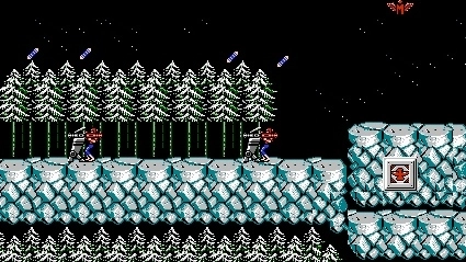 本关以及后面的关卡,和第一关的前进方向一致,都是向右行进。这一关的场景设定在雪地之中(值得一提的是,日本版本里还会有漫天飞雪的效果),敌人大多是待在固定位置、操控着定向机关枪的士兵。另外,一定要格外留意从地下抛出来的手榴弹!