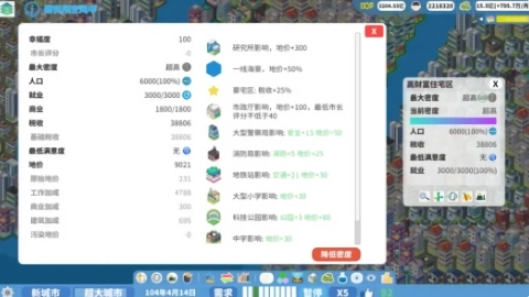 1、地价系统:游戏的核心玩法是,地价受商业区与办公区的双重辐射影响,再搭配完善的市政设施,以此打造城市的价值高地。
