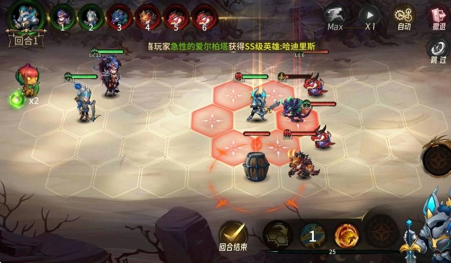 3、在六边形网格战场上灵活调整英雄站位,借助火药桶等场景机关扭转战局,达成以智取胜的战术目标。