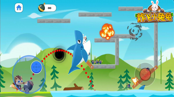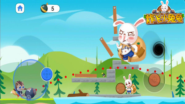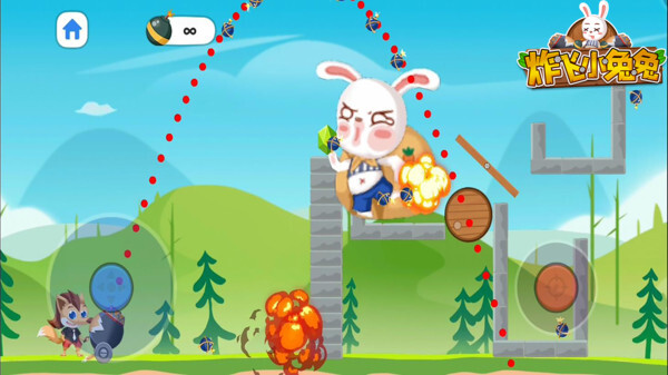 《炸飞小兔兔》是一款趣味十足的休闲闯关游戏,玩家只需用左手拇指拖动屏幕上的摇杆,就能调整炮弹的发射角度与力度;再用右手拇指点击瞄准区域,即可发射炮弹,将藏在各个角落的小兔子炸飞。