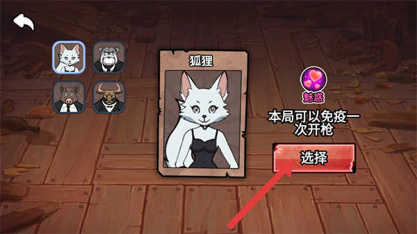 2、进入角色选择界面后,挑选自己心仪的角色,像狐狸就挺不错,它具备免疫一次开枪攻击的技能;选定角色后,即可进入对战环节。