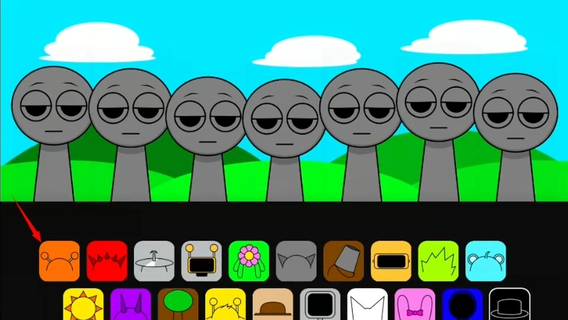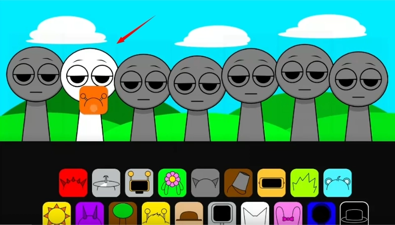 3、sprunki模组的一大特色是恐怖模式,接下来我们把最后一顶黑帽子拖到角色身上。