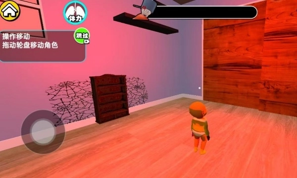 1、拖动左下角轮盘能灵活操控角色移动,借此熟悉房间布局,为后续的捣蛋路线提前做好规划。