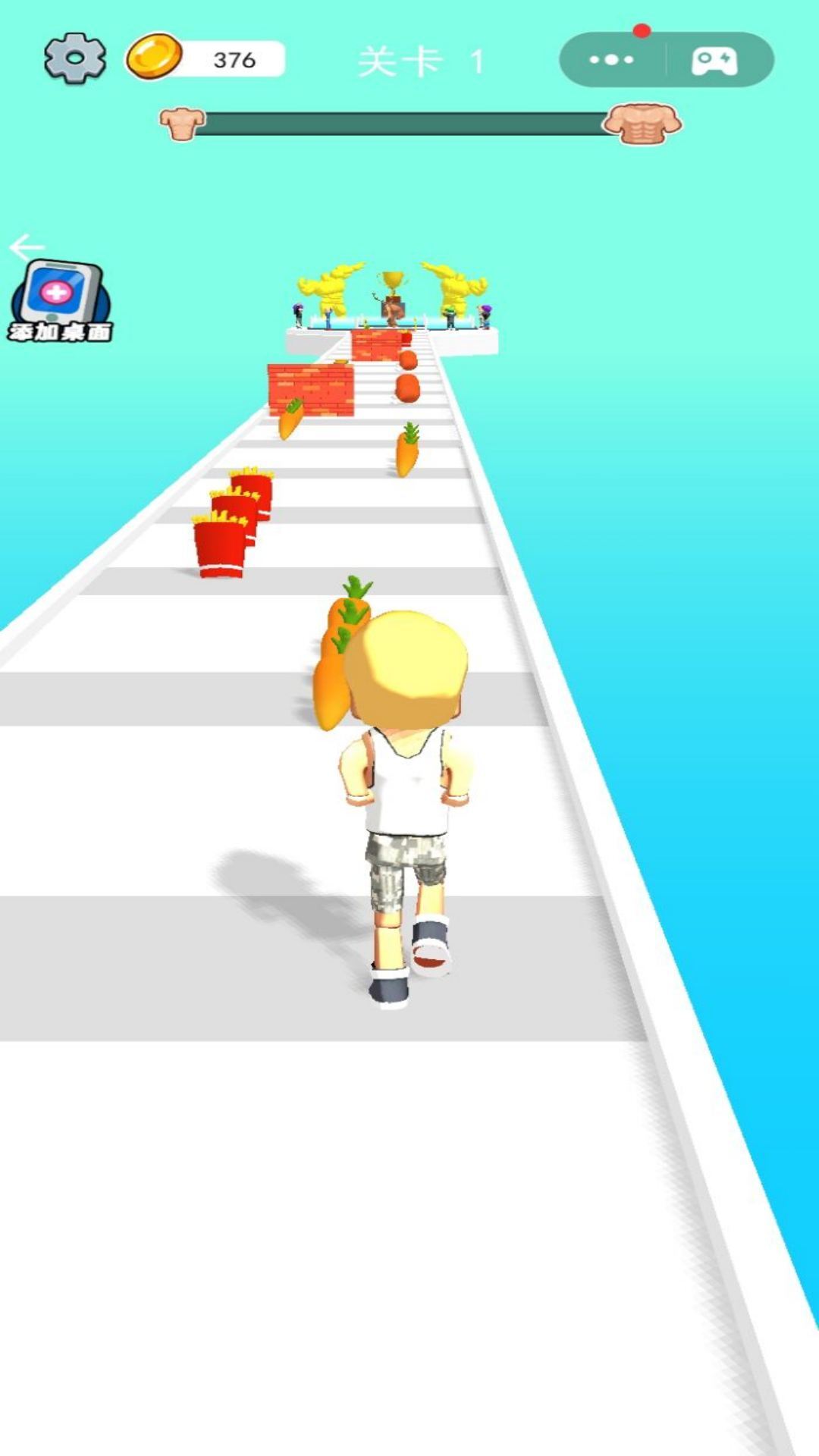 1. 在跑道场景中操控角色进行左右移动或跳跃动作,通过收集鸡胸肉、蛋白粉这类健康食品来提升肌肉数值,与此同时要避开甜甜圈、可乐之类的陷阱,防止角色体型变小。