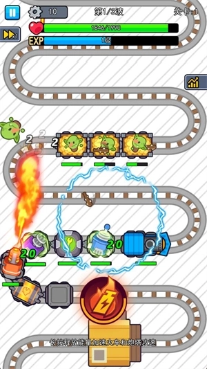 3、放好炮塔后点击开始战斗火车会自动前进,车厢上的炮塔也会自动攻击,点击屏幕中间的按钮可以加速火车和炮塔攻速。