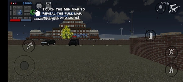 2、滑动右侧虚拟摇杆移动,左侧触控区控制视角转向,屏幕底部功能键实现蹲伏、翻越、投掷等动作。