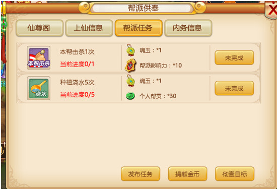 当仙尊阁等级达到2级及以上时,帮派的帮主或长老便能够发布帮派任务;仙尊阁的等级越高,可发布的帮派任务数量也就越多。