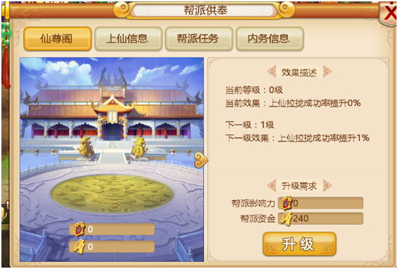 升级:帮主或长老可以点击操作,通过消耗帮派影响力与帮派资金来提升仙尊阁的等级。