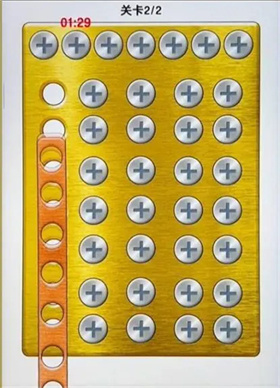 3、等右下角以及下面一排的铁片都掉落之后,再把从下往上数第三排的螺丝取下来,移动到下方对应的洞里。