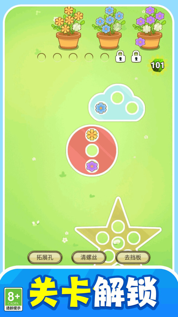 2、遇到难以攻克的关卡时,游戏里有不少实用道具能派上用场:拓展孔能让你的操作空间变得更开阔,清螺丝道具则可以帮你迅速扫除障碍;