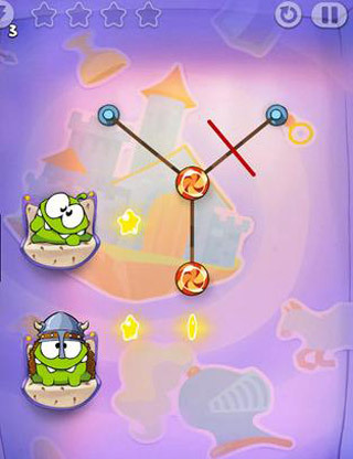 第四关的操作方法是:先对左边的糖果切一条竖线,等它吃到星星后,就把最左边的线切断。右边的绳子按照同样的方式操作即可。