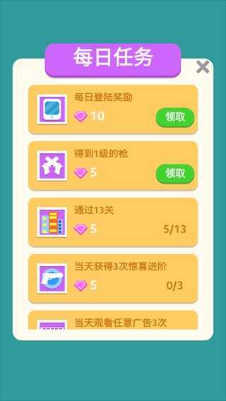 1、运用卡通风格的画面与配套的背景音乐,使玩家获得沉浸式的射击体验。