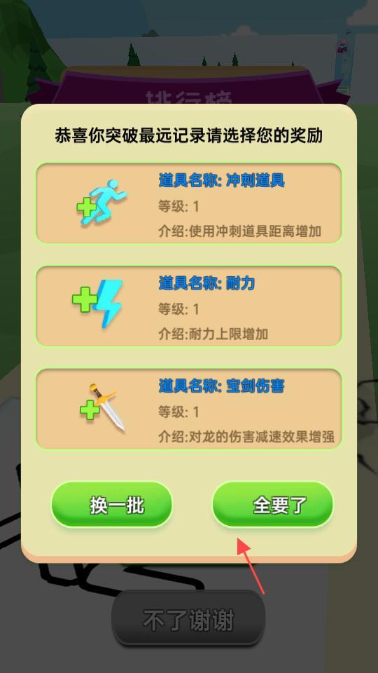 3、飞行结束且突破最远记录后,会弹出奖励选择界面,你可以依据自身需求挑选冲刺道具、耐力、宝剑伤害等奖励,还能选择换一批奖励或者全部领取,以此提升后续的飞行能力。