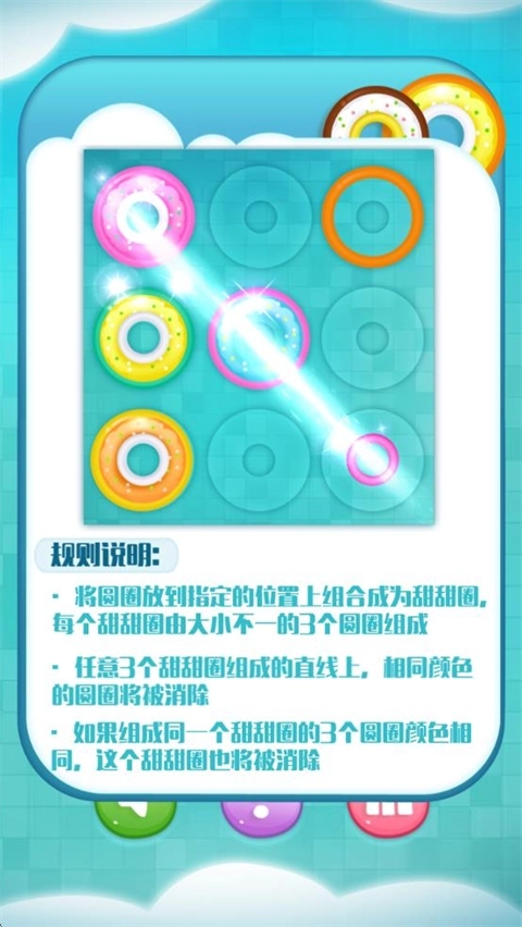 2、当任意三个甜甜圈连成一条直线时,颜色相同的圆圈就会被消除;