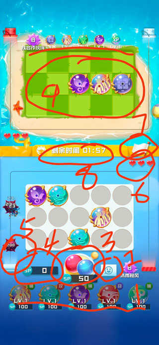 (1)你所选用的球球阵容,以及对手选用的球球阵容,就是被红色横线标注出来的那两个。关于阵容的具体内容后面会详细说明,这里暂时先跳过。