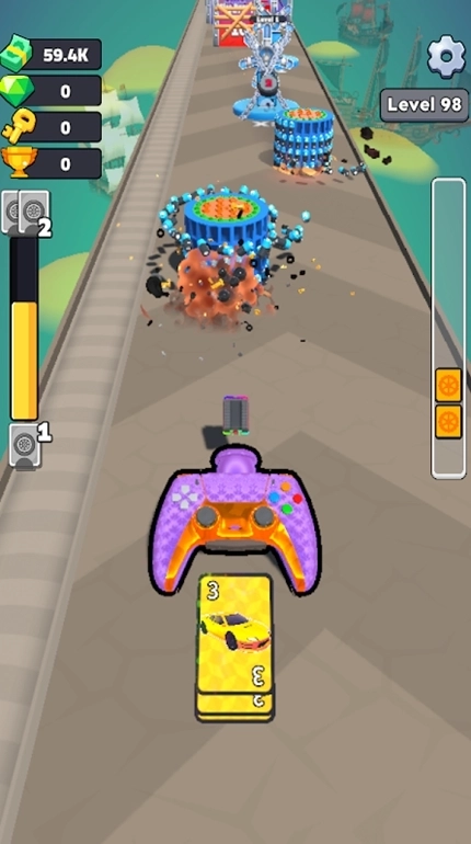 卡片轮盘(CardWheels)游戏的闯关方式很独特,关卡里面有一个类似游戏手柄的装置,后面有很多赛车卡牌,通过这个手柄之后,赛车就能撞击道路上面的障碍物,卡牌里面还有增加赛车速度的道具牌,赛车拥有这个加成之后,撞击力度将会更大,一些大的障碍物也可以破坏掉啦!