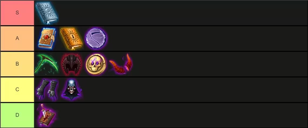 - A级:能量法典(7点神性,附加穿刺、破防、物理属性,以及空间共鸣突破效果),死亡符文(强化死亡共鸣的增伤作用),游戏规则书(提升技能子弹的数量)