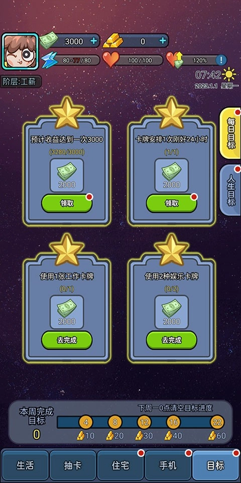 5、通过执行卡牌效果来完成既定目标,完成后可以领取额外的钞票奖励。