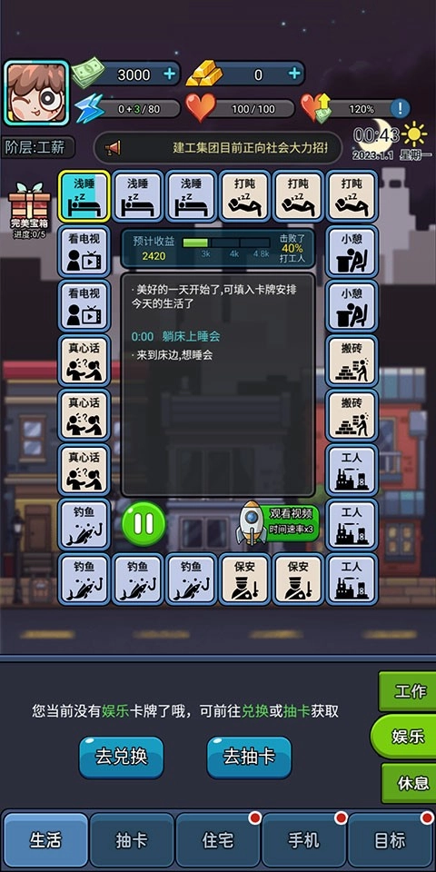 4、开启后,时间就会开始流逝,并执行每一张卡牌的效果,如恢复状态、赚取薪水等。