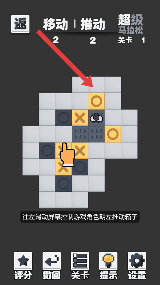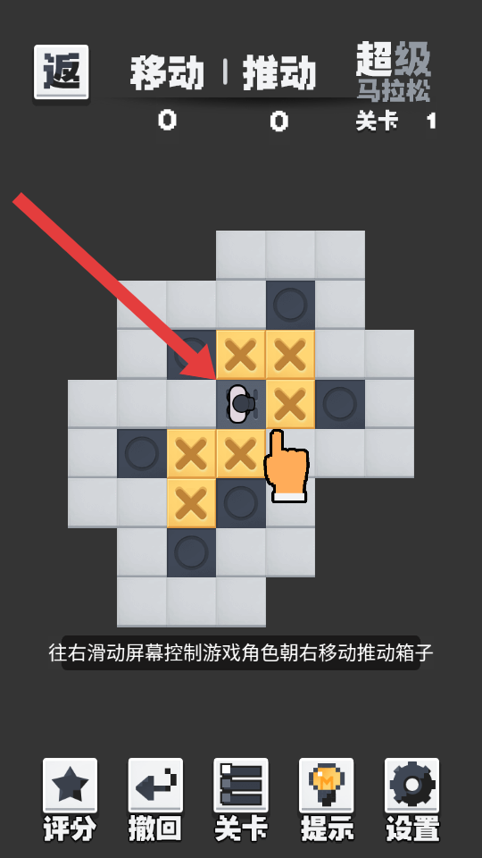 2、滑动屏幕可操控游戏角色移动,当角色与箱子处于相邻位置时,保持向箱子的方向滑动屏幕,即可推动箱子。