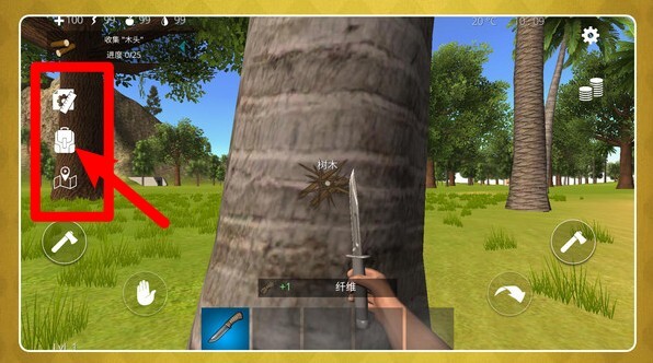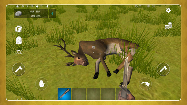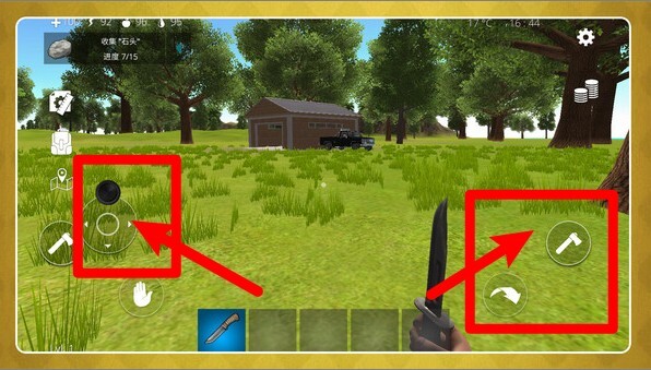 3. 左下角的虚拟摇杆负责操控移动,右侧区域分布着工具键与攻击键;要依据不同环境灵活切换刀、斧这类采集用武器,同时得留意体力值和背包的容量,防止出现负重过高的情况。