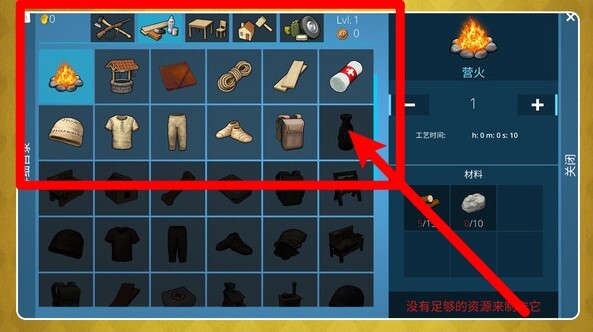 1. 界面左侧设置配方与物品栏,点击箭头选中对应选项后,右侧将显示详细信息;从界面中可看到,营火的制作需要十个石头,同时还会显示制作所需时长,若材料数量不足,系统会提示无法进行建造操作。