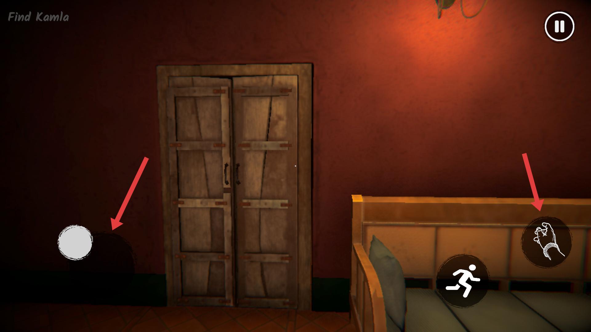 2、按照箭头的指引,右侧的拳头按钮是用来进行操作的,首先要检查门是否能够开启,接着探索床以及它的周边区域,寻找相关线索,以此推进寻找Kamla的任务。
