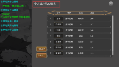 2、点击进入个人战力前20的查看界面,可清晰知晓本门弟子在全服的战力排名,同时也能了解其他门派高手的境界与战力数据,借助对比来判断本门弟子的培养成效。
