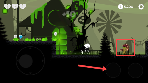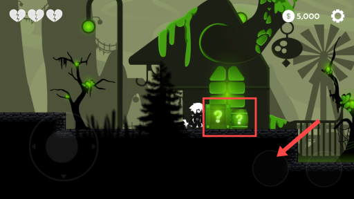 2、进入关卡后,借助左下角的虚拟方向键操控骑士移动,当靠近像红框里带有问号的箱子时,点击红色标识的【攻击键】把箱子破坏掉,以此获取道具和金币。