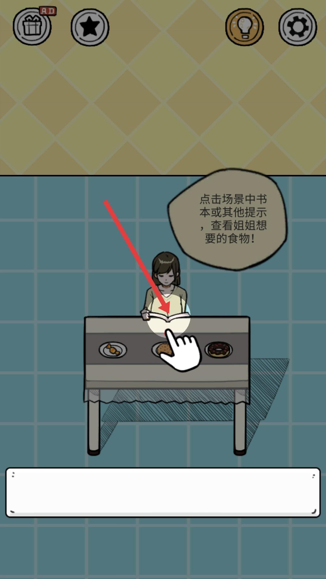 2、在游戏场景里点击姐姐面前的书本,查看她想吃的食物,依据提示备好食材,试着制作料理。