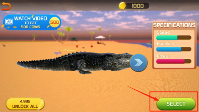 2、点击绿色的SELECT按钮来挑选鳄鱼,既可以通过观看视频获得500金币,也能解锁全部内容以拓展选择范围。
