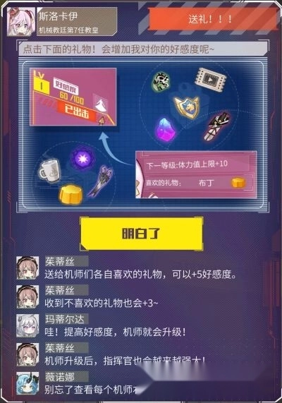 在每个机师页面里可以送给她喜欢的礼物,提升好感度,从而升级机师哦。