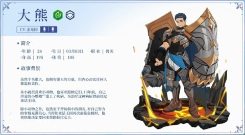 大熊身形高大、孔武有力,可内心却无比柔软善良。他对一切可爱的事物都满怀热忱,平日里热衷于收集卡通模型,也十分喜爱小动物。虽说外表瞧着是个十足的硬汉,可实际上却是个能给人带来温暖的大哥哥。