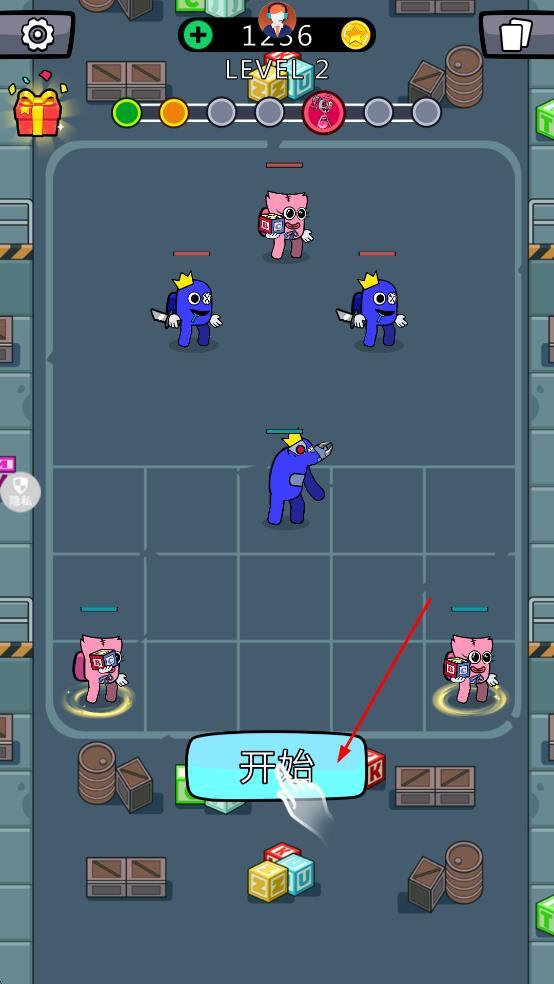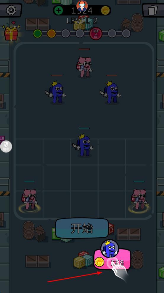 1、点击粉色按钮并消耗288金币,即可解锁蓝色角色或对其进行升级,以此提升战力来应对关卡挑战。
