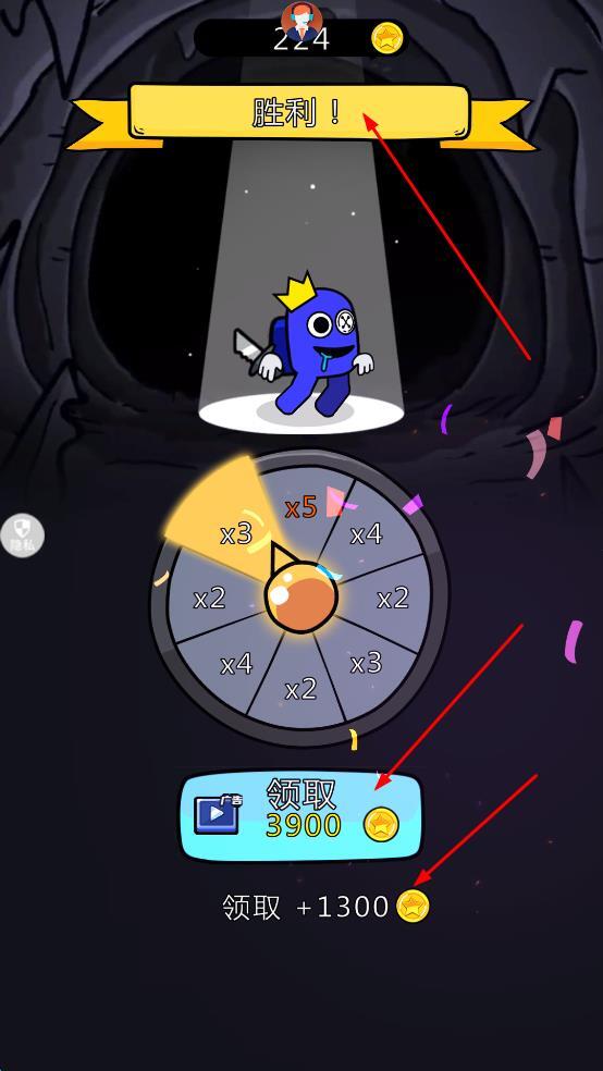 4、战斗胜利后,你可以选择看广告领取3900金币,也可以直接领取1300金币来获取奖励。