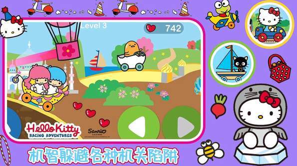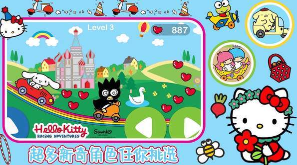 1. 角色与赛车:在游戏里,玩家能够挑选凯蒂猫和库洛米、美乐蒂等其他三丽鸥萌系角色,每个角色都配有专属的赛车样式,让游戏的多样性和可玩性得到了提升。