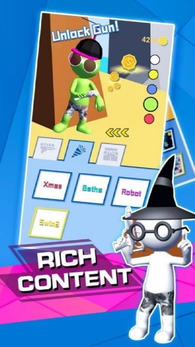 这款有趣的游戏里包含着各种各样的不同关卡,游戏风格是卡通类型的,完成任务就能得到解锁新武器的机会,游戏中还有各类皮肤等待你去解锁,赶紧来体验一下吧。