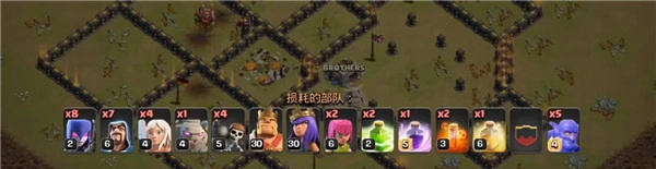 这是一套围绕野猪构建的流派,不过野猪需要等到后期时机合适再释放,前期主要依赖胖法或者天女来清理大部分边路建筑,并且这个流派也比较依赖援军的蓝胖,要是没有蓝胖,效果可能就没那么强了。